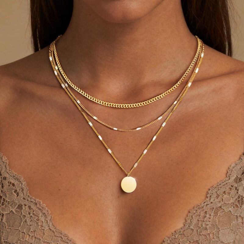 WomenGifts Layered Gold Necklaces for Women, 14K Gold Sterling Silver Plated Dainty Pendant Necklace Set with Cubic Zirconia Circle Style 2